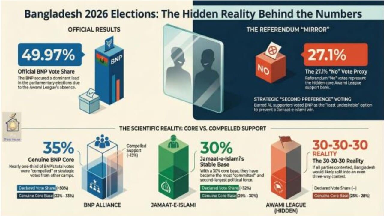 - BNP’s Actual Weight: Out of the 50% votes received by the BNP, approximately one-third were cast under “compulsion” or “political strategy” due to the Awami League’s absence. Their own genuine vote bank is around 35%.